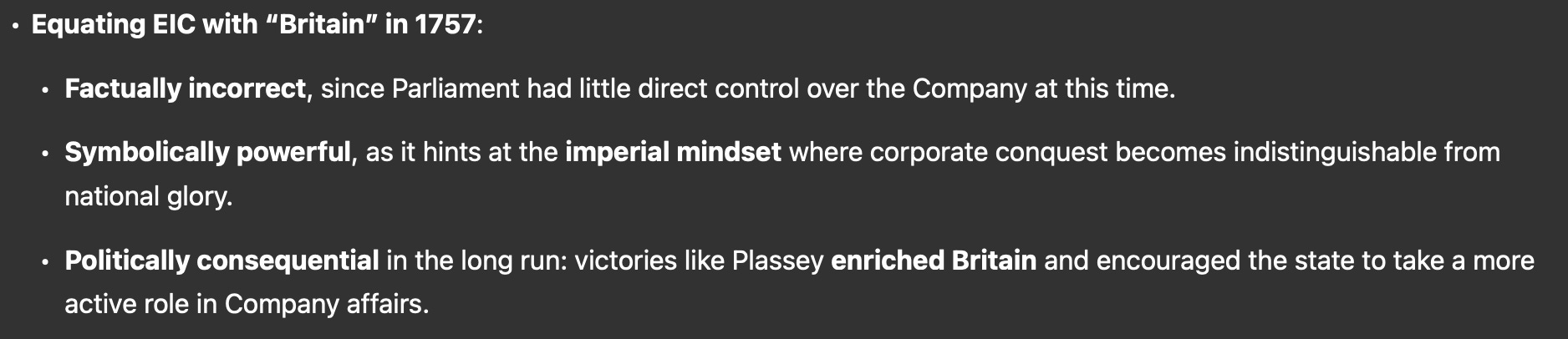 - You’re now free to Google facts you’ve used along the way. If the history of India’s colonisation is central to the document you’re building, now is the time to check if the Battle of Plassey was fought – as you remember – in 1756. It wasn’t; it was in 1757. If its belligerents were the British and the Nawab of Bengal, Sirajuddaullah. It was indeed the British East India Company – which many might consider semantically identical to Britain – on the one hand, and the Nawab of Bengal, Sirajuddaullah, and the French East India Company – which many might consider semantically identical to France – on the other. What are the political implications of equating the British East India company to Britain? In 1757, in particular? Was this before Britain assumed full control over the territories of the East India Company? Or was that Victoria, and did it happen closer to 1857? This needs ChatGPT. Ask it. It will say the following.