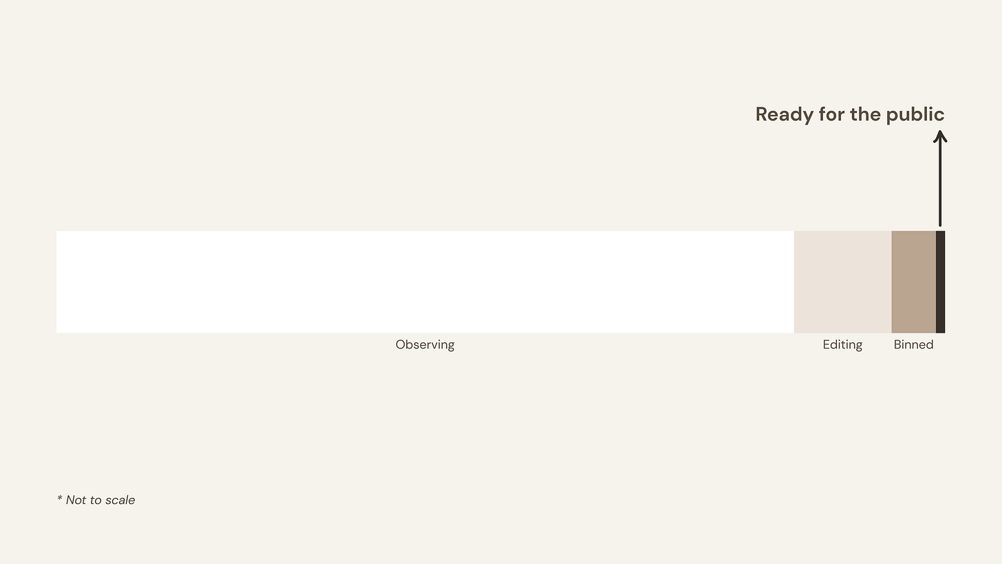 Firstly, we mistakenly think creating art must feel like how it feels to consume it. It does not. For every hour of consumption-ready art, there’s likely five binned hours of consumption-unready art, ten hours of making the one hour that’s worth consuming worth consuming, a hundred hours of practice, presence, observation. That is, for every hour of ‘sexy’, there’s maybe one hundred and fifteen hours of ‘unsexy’.